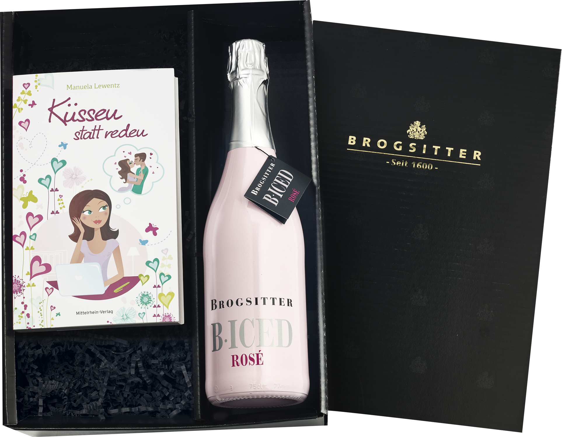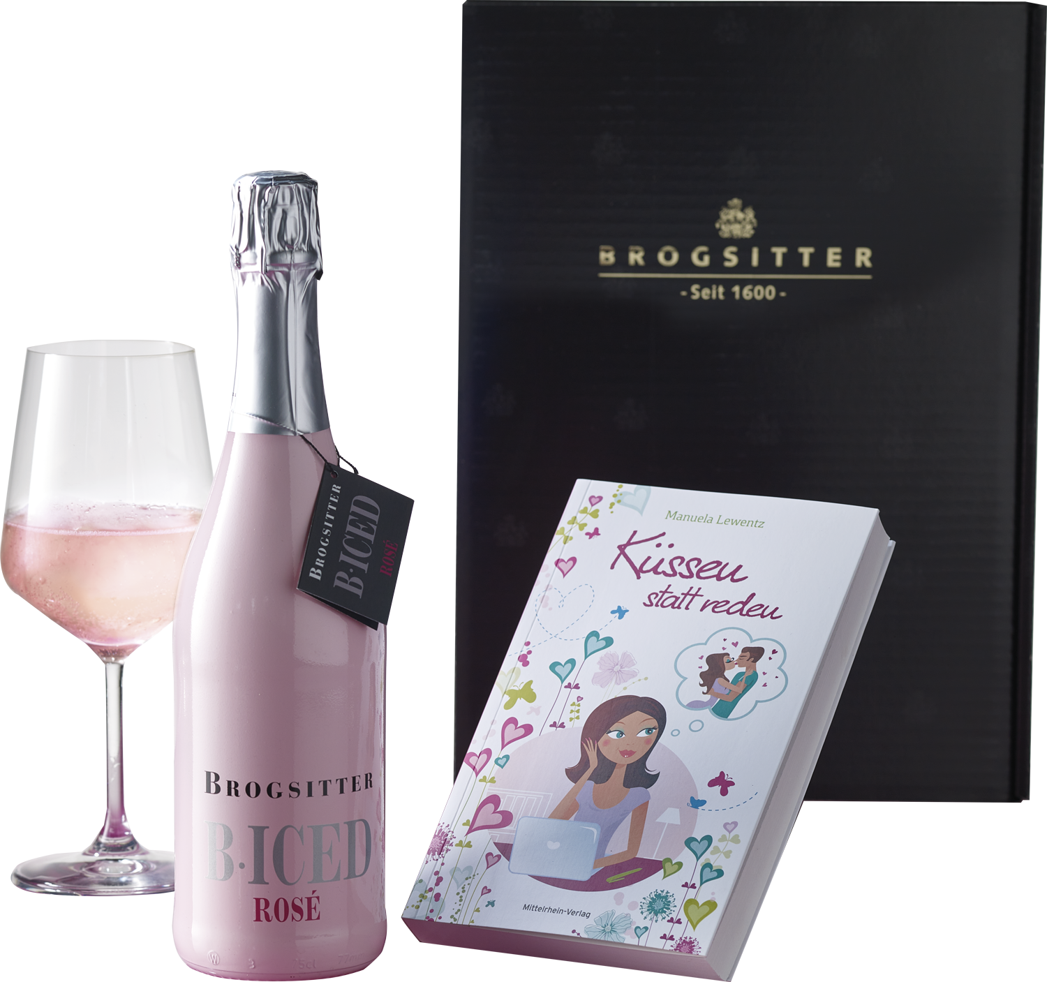 Genießen Sie den neuen Roman von Manuela Lewentz "Küssen statt reden" mit einem Glas unseres wundervollen Brogsitter B · ICED Rosé Sekt! Sie erhalten: