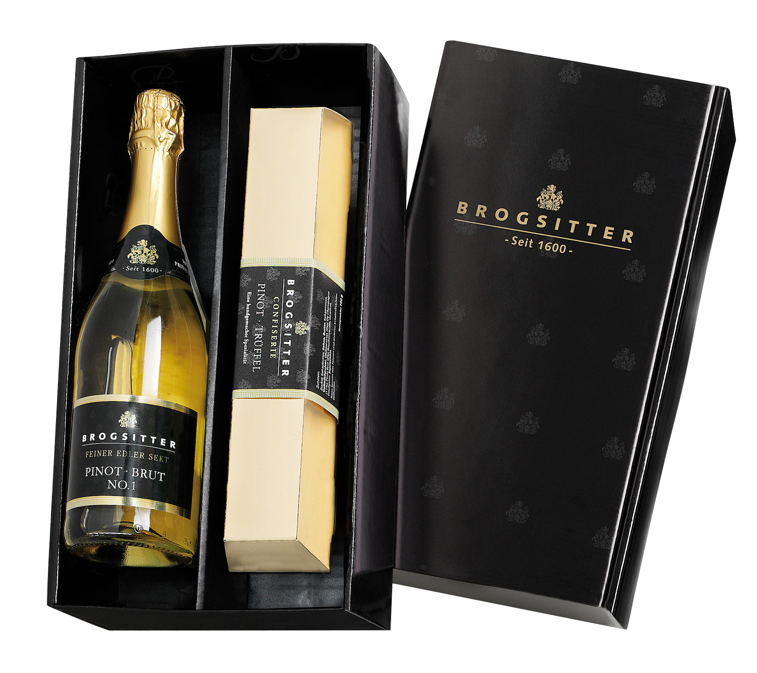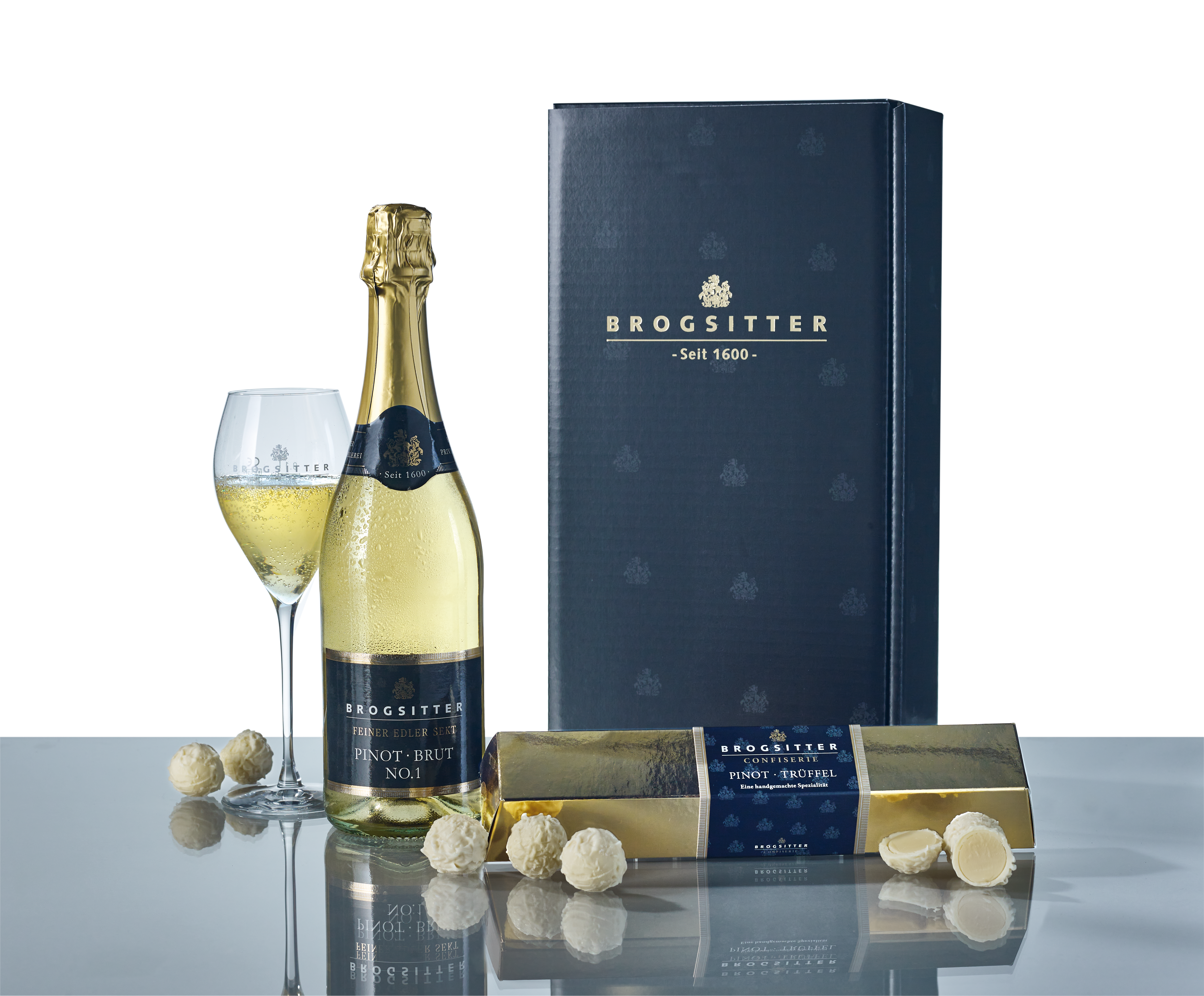 Ein rassig-fruchtiges Bukett mit zartem Nusston und feinperligem Mousseux – ein Premium-Sekt aus Burgunderweinen, der durchaus auf dem Niveau eines guten Champagners liegt. Passend dazu die besonderen Pinot Trüffel im Goldbarren – Brogsitter Confiserie der Spitzenklasse!